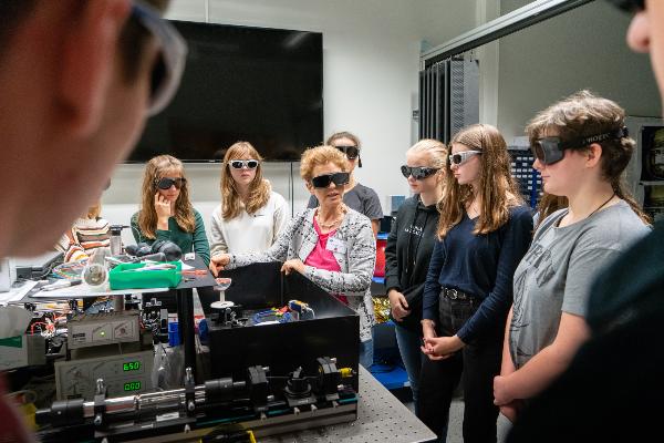 Leiterin Silke Stähler-Schöpf erklärt Schülerinnen und Schülern am PhotonLab Grundlagen der Quantenphysik.