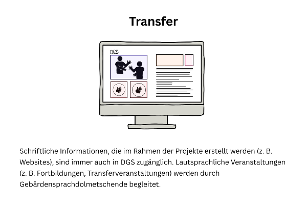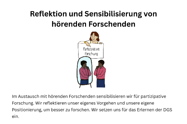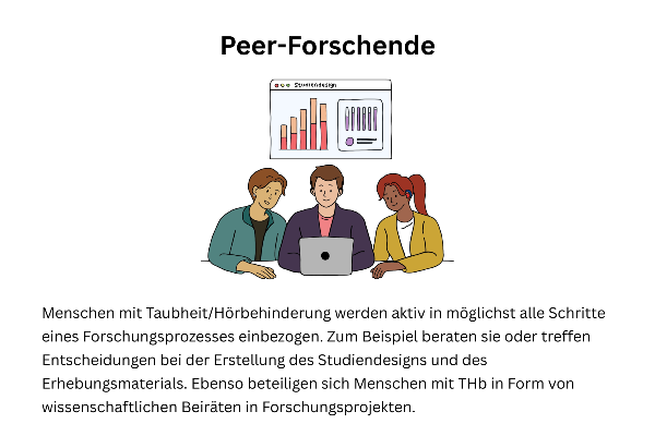 In unseren Forschungsprojekten werden zum Beispiel Menschen mit Taubheit/Hörbehinderung als Peer-Forschende, als Kooperationspartner:innen oder als Expert:innen für ein bestimmtes Thema aktiv eingebunden. Auch arbeiten wir mit Vertreter:innen (mit oder ohne Taubheit/Hörbehinderung) aus Elternverbänden, aus der pädagogischen Praxis oder aus Fachberatungsstellen zusammen. Diese Vorgehensweise soll zur Validität wissenschaftlicher Erkenntnisse beitragen und dem Transfer wissenschaftlicher Erkenntnisse in die Praxis dienlich sein. Zudem kann angenommen werden, dass partizipative Ansätze eine größere Nachhaltigkeit besitzen, da sie an die Bedarfe von Beteiligten angepasst sind.