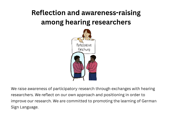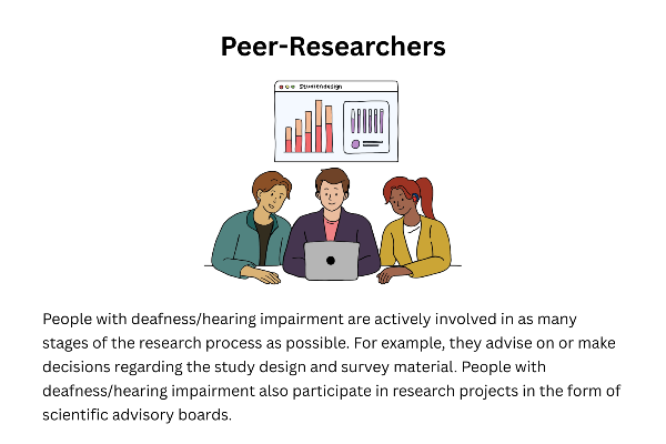 In our research projects, for example, people with deafness/hearing impairment are actively involved as peer researchers, cooperation partners, or experts on a specific topic. We also work with representatives (with or without deafness/hearing impairment) from parents' associations, educational practice, or specialist counseling centers. This approach is intended to contribute to the validity of scientific findings and facilitate the transfer of scientific knowledge into practice. In addition, it can be assumed that participatory approaches are more sustainable because they are tailored to the needs of those involved.