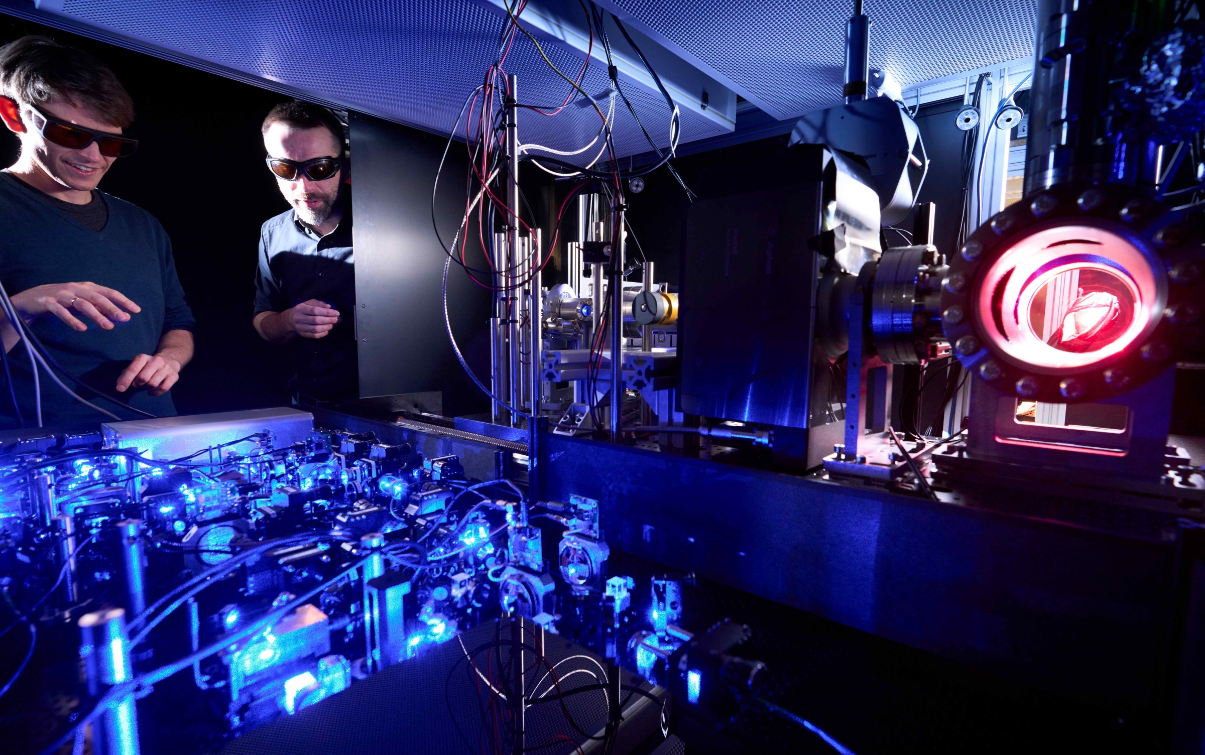 Prof. Johannes Zeiher (left) in the laboratory with typical setups for a quantum simulation experiment