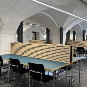 Located in the historic vaulted ceiling of the LMU main building on Geschwister-Scholl-Platz, the UniLounge offers around 100 barrier-free workstations. The open-plan design combines areas for individual and group work with so-called “thinking cells” for particularly concentrated work.