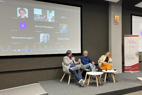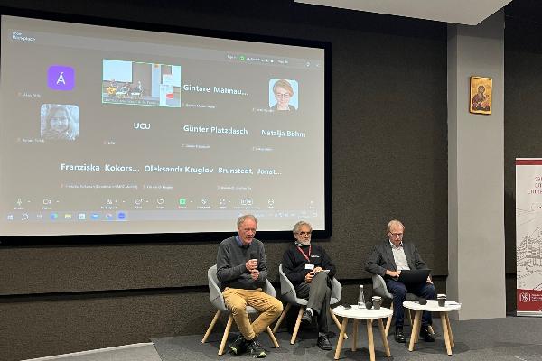 In his welcome address Taras Dobko, UCU rector, referred to the ongoing Russian attacks against his city by stressing that this war is not only a confrontation “between armies, but also between narratives and values”. Fact-based scientific work, Dobko said during the opening, should enable everybody to recognize and reject false “Nazi accusations” directed against Ukraine.