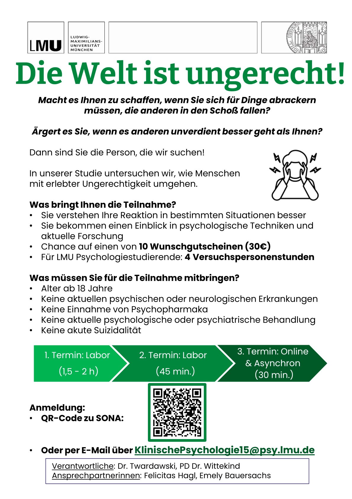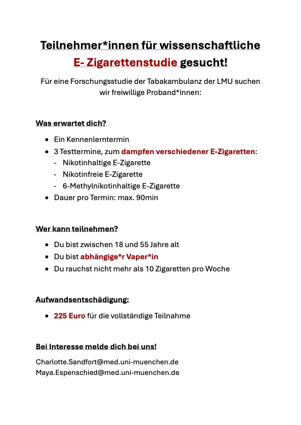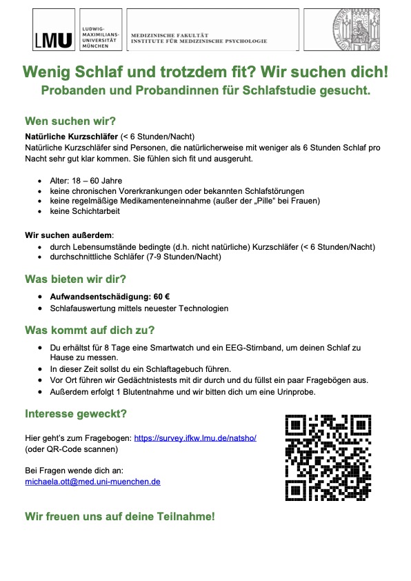 Als Vergütung erhältst du bis zu 20€! Alternativ können Psychologiestudierende der LMU oder CFH teilnehmen, um bis zu 3,5 Versuchspersonenstunden zu verdienen.