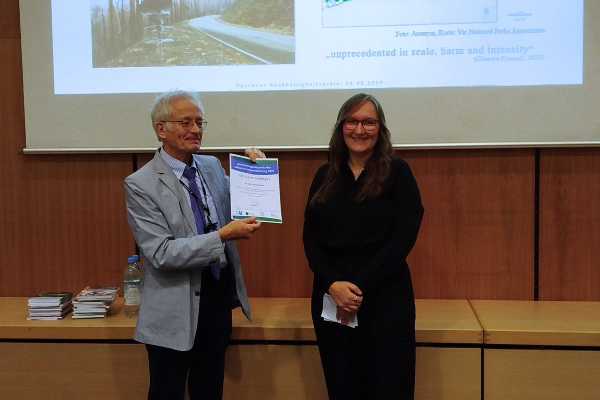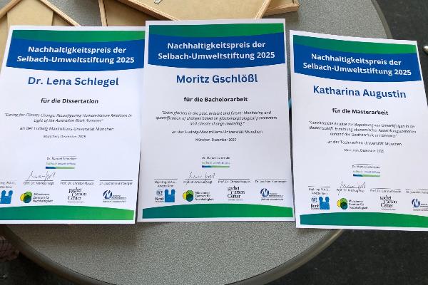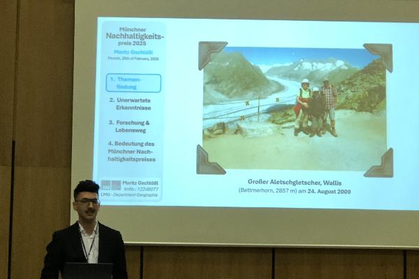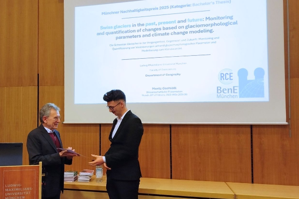 Der Münchner Nachhaltigkeitspreis ging an Moritz Gschlöß (LMU) für seine Bachelorarbeit zur Entwicklung und Modellierung Schweizer Gletscher, an Katharina Augustin (TUM) für ihre Masterarbeit zur ökonomischen Bewertung von Umweltfolgen in der Bauwirtschaft sowie an Dr. Lena Schlegel (LMU) für ihre Dissertation zu neuen Mensch-Natur-Beziehungen im Kontext des australischen „Black Summer“. Die Laudationen hielten Dr. Andreas Kratzer, Dr. Joachim Hamberger und Prof. Dr. Gerhard Müller-Starck.
