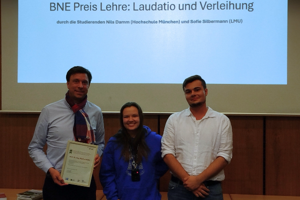 Sofie Silbermann (LMU) und Nils Damm (HM) verkünden die Auszeichnung von Prof. Dr.-Ing. Markus Klein (HM) mit dem BNE Sonderpreis Lehre für seine innovative Lehrveranstaltung zu nachhaltigem Produktdesign.