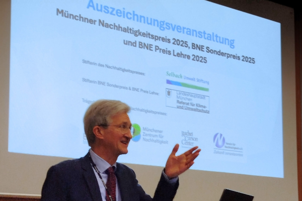 Ein besonderer Höhepunkt des Abends war die erstmalige Verleihung des BNE Preis Lehre. Ausgezeichnet wurde Prof. Dr.-Ing. Markus Klein von der Hochschule München für das Modul „Produktanalyse und -optimierung auf Nachhaltigkeit“. Die Auszeichnung basiert auf einer Nominierung durch Studierende und wurde von studentischen Beiträgen der LMU und der Hochschule München begleitet, es sprachen Sofie Silbermann und Nils Damm.