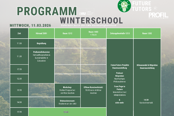 Wie kann Nachhaltigkeit an der LMU konkret aussehen - in Lehre, Studium, Organisation und Alltag? Die Winterschool der FutureTutors von PROFiL am 10. und 11. März 2026 lädt alle Angehörigen der LMU ein, diese Frage gemeinsam zu erkunden. Dafür wird die Zeitungslesehalle in der Leopoldstraße 13 zum offenen Begegnungsraum für alle, die Nachhaltigkeit nicht nur diskutieren, sondern aktiv gestalten möchten.