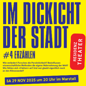 In einer faktenbasierten Welt sind Theater und Forschung zwei Seiten einer Medaille. Dieser Idee folgen wir mit unserer Kooperation zwischen dem Residenztheater und der LMU München. In unserer Veranstaltungsreihe «Im Dickicht der Stadt» laden wir dazu renommierte Wissenschaftler*innen der LMU in die Spielstätte Marstall ein. Gemeinsam mit ihnen spielen, diskutieren und kontextualisieren Mitglieder des Ensembles wissenschaftliche Diskurse rund um Klimawandel, Ökologie und Nachhaltigkeit. Zusammen entwickeln wir innovative Ästhetiken, transdisziplinäre Ausdrucksformen und neue Formate der Wissensvermittlung an der Grenze von Kunst und Wissenschaft.