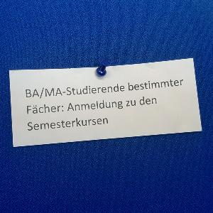 BA/MA-Studierende bestimmter Fächer: Anmeldung zu Kursen im Sommersemester 2026Sie wollen/müssen einen Sprachkurs im Rahmen Ihres Hauptfachs besuchen? Melden Sie sich bitte im Zeitraum Montag, 23.03.2026, 00:00 Uhr bis Dienstag, 07.04.2026, 24:00 Uhr online über LSF (über den Modulbaum) zum gewünschten Sprachkurs an.